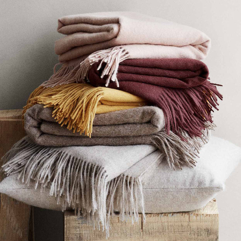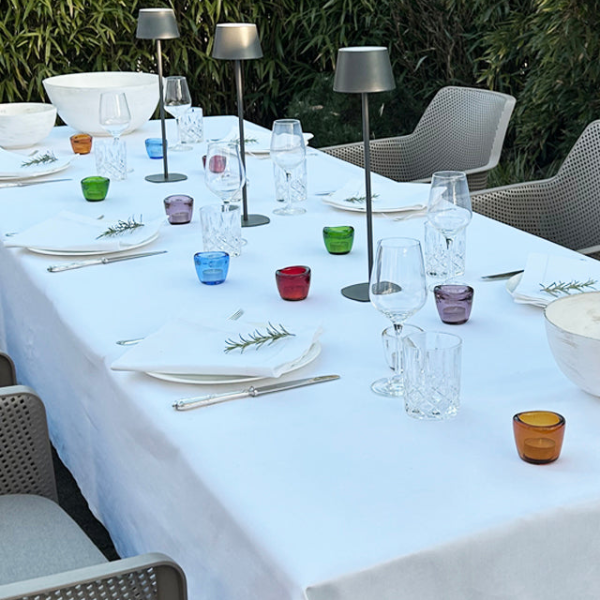 Gedeckter Tisch mit Tischdecke Como von Lindhorst im Garten auf langem Tisch