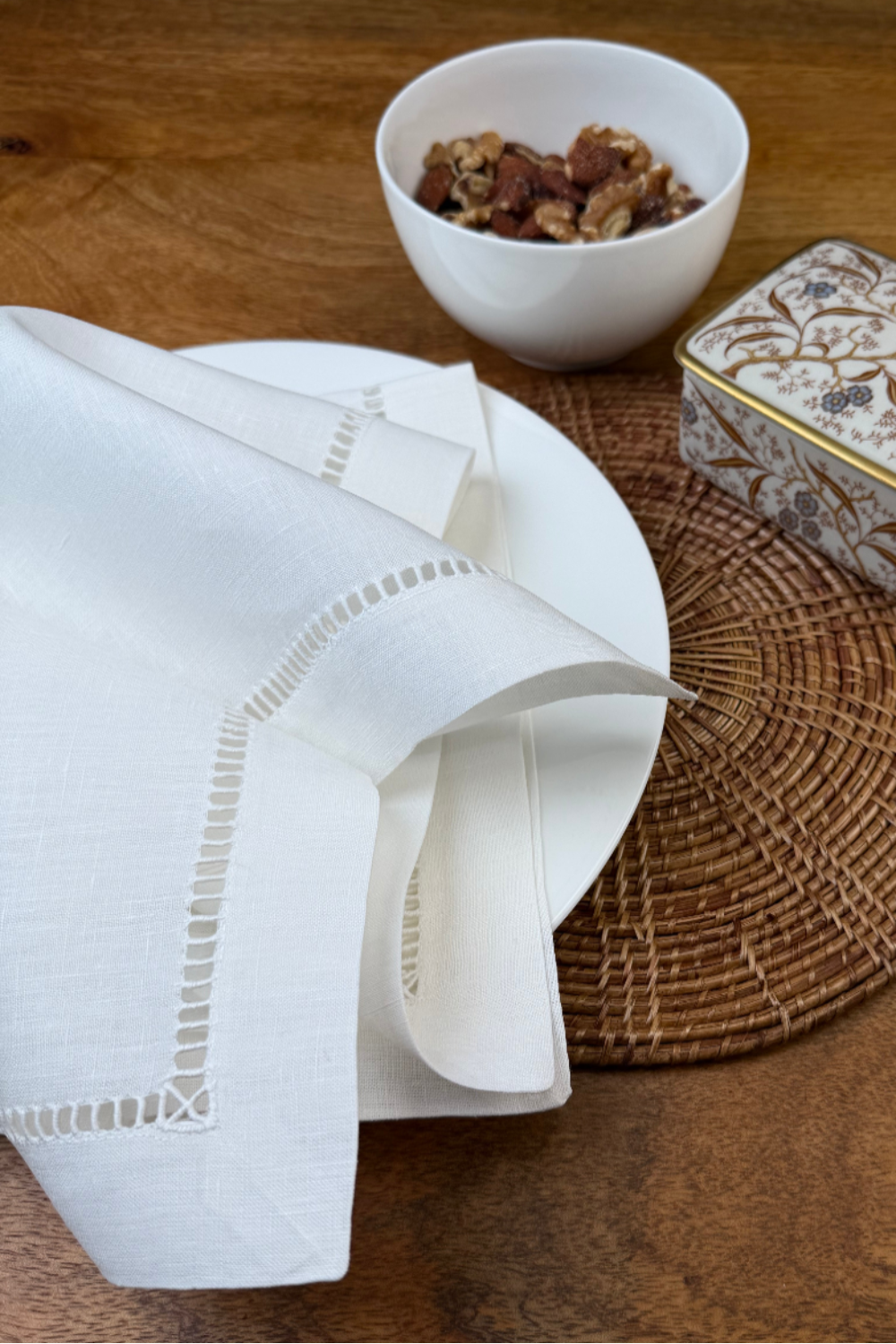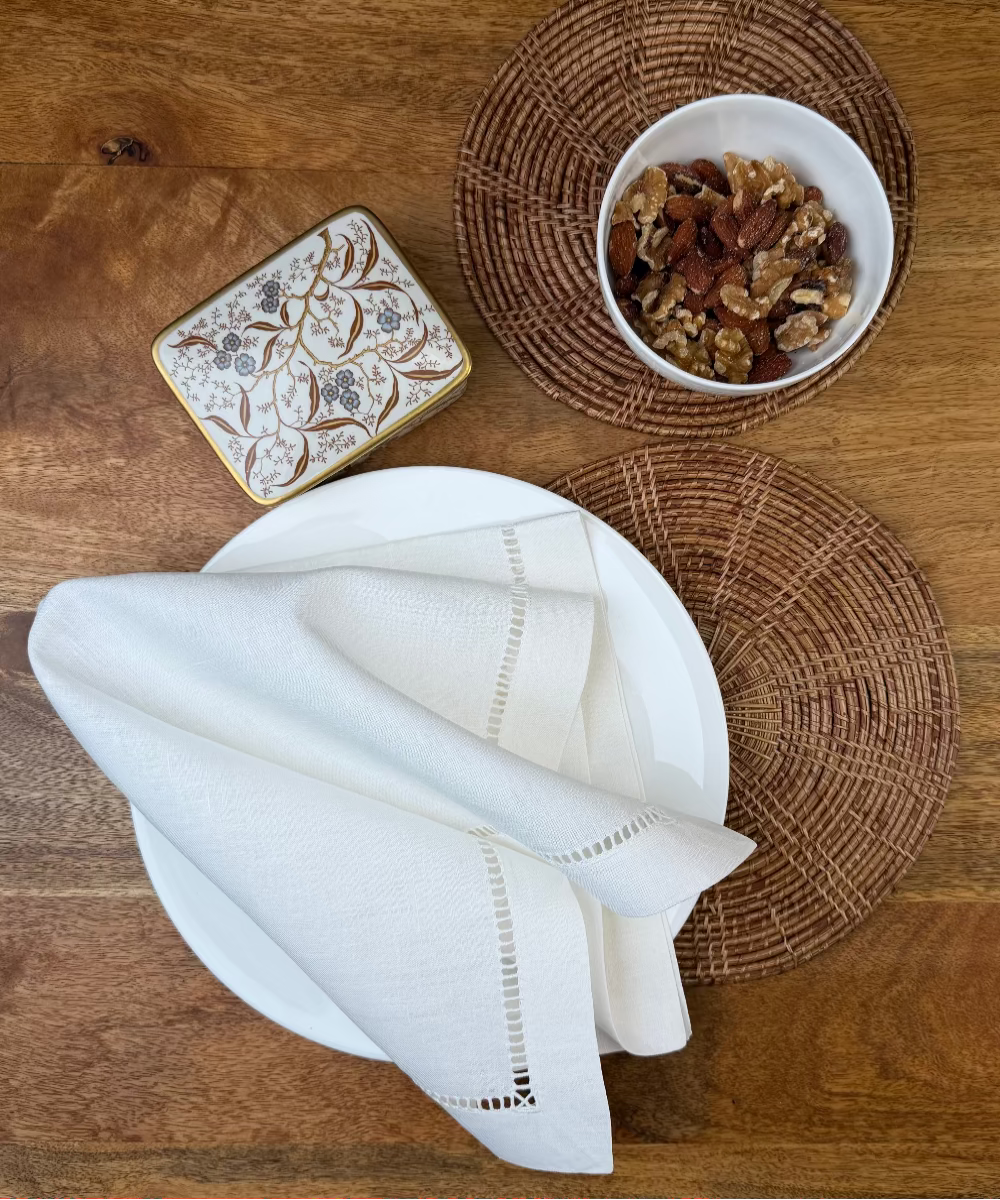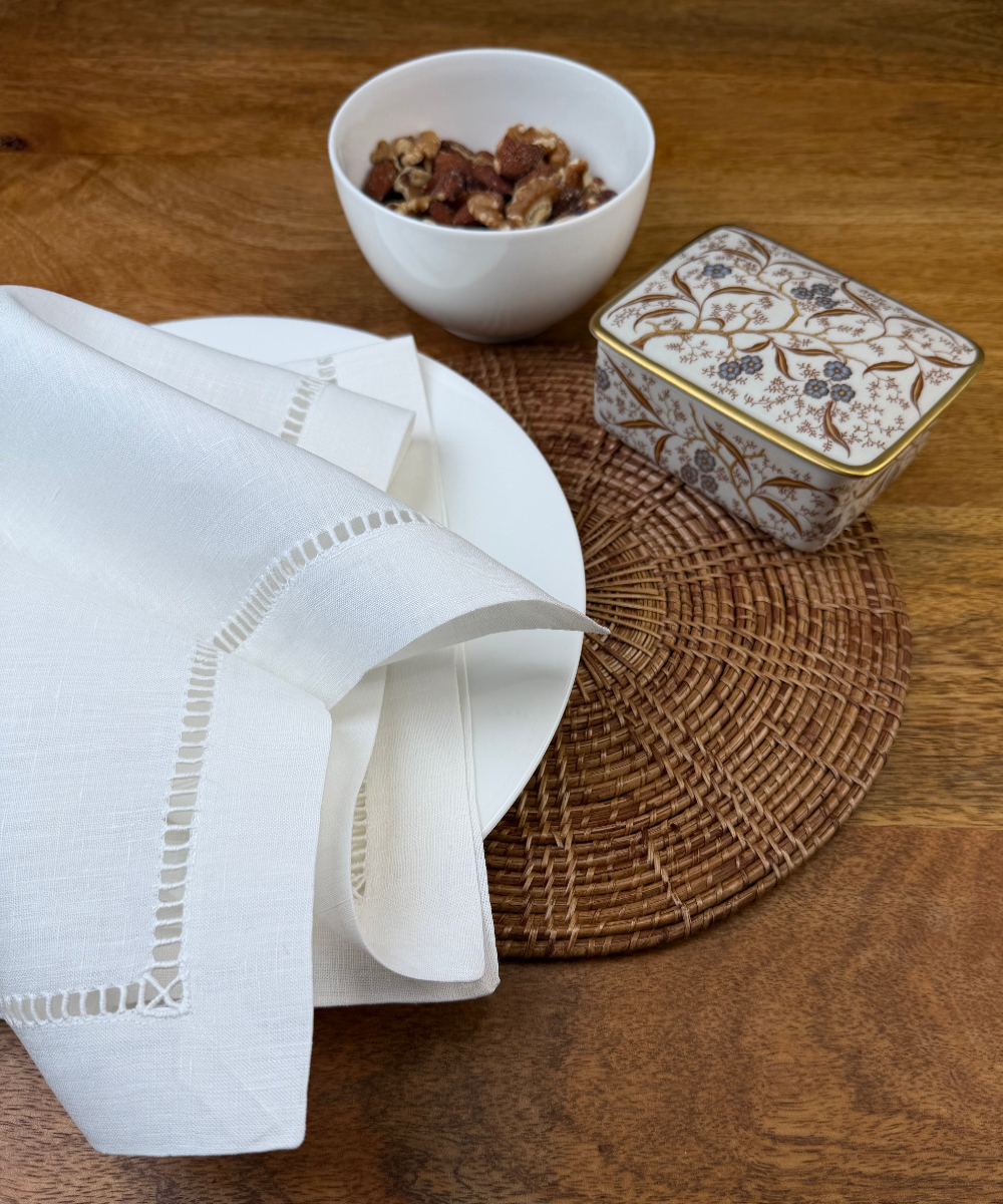 Entdecken Sie Riva – die edle Leinenserviette mit Hohlsaum, die sofort ins Auge fällt und mit höchster Qualität überzeugt. Bei der Herstellung wurde nur bestes Leinen verwendet, was man sofort spürt und sieht. Der handgestickte Gitter-Hohlsaum verleiht Riva eine unvergleichliche Eleganz, die jeden gedeckten Tisch zu etwas Besonderem macht.