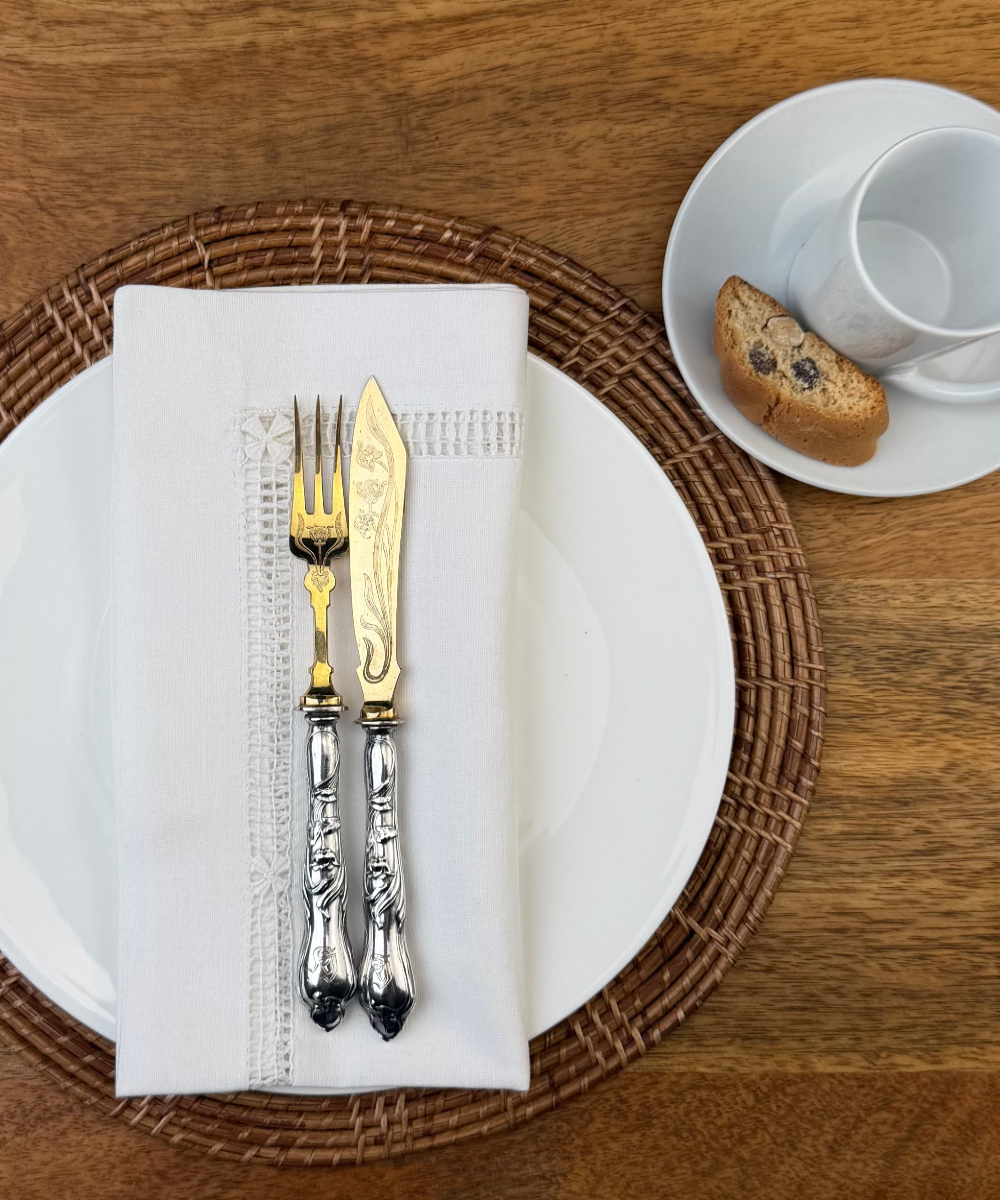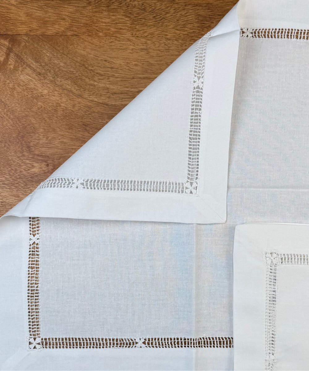 Ein besonderes Highlight ist der außergewöhnliche handgestickte Hohlsaum. Mit seinen präzisen gestickten Kreuzungen verleiht er der Serviette eine schnörkellose, graphische Eleganz, die sich perfekt in moderne Umgebungen einfügt und jedem Tisch einen Hauch von Exklusivität verleiht.
